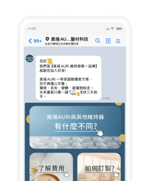 About Us關於我們 關於 AURi 維持器 AURi奧瑞維持器是100%台灣團隊打造的維持器品牌。因為維持器不是只戴一、兩個月,是矯正族群們長期的夥伴、戰友。我們看到許多實際配戴的耗損、不適以及許多人的遺失經驗,理解了大多數人難以堅持的痛點,奧瑞希望解決這些痛點,輕鬆成為矯正維持的日常夥伴! 我們的理念 AURi奧瑞致力於將矯正維持痛點,轉化為更無痛入手、更方便加購的方案。與臺灣醫療科技廠攜手製成,將省下的國際物流與層層代理費用,直接回饋給消費者。但品質與專業絕不妥協!不只希望提供平價維持器,也希望透過正確使用觀念,協助使用者建立最佳的配戴與保養習慣。 以使用者為設計出發 AURi 奧瑞經過近10年的田調,深刻理解使用者日常以及透明維持器最常遇到的狀況,從磨損原因、變形造成的齒列變動程度、清潔問題影響牙齒健康…等,得知維持器在矯正後扮演的重要角色,都是奧瑞在設計維持器材質、方案前反覆見識的重點。因此,奧瑞希望降低使用者在每個環節的不安與負擔,讓維持器成為生活中穩定、可靠的戰友。 AURi 的優勢產品與服務 年度守護計畫 外出遺失或暫時找不到時,不必再焦慮或立刻重做。 奧瑞守護計畫,讓遺失維持器不再成為你的困擾。 三層耐用結構 我們選用適合日常、夜間配戴與反覆使用都耐得住的三層式結構設計。讓你使用起來更安心無虞。 方便快速的流程 不用花時間反覆溝通與等待。流程設計簡單明確,在你需要維持器的時候,更快完成、更少等待。 歡迎透過 LINE 聯絡我們! 一對一 LINE 諮詢,回覆清楚、不用反覆說明可直接傳送需求內容,協助快速確認適合的方案支援文字與圖片傳送,溝通更直覺由專人協助回覆,提供實際可行的建議 LINE@ 聯繫奧瑞客服 PAYUNi 統一金流付款